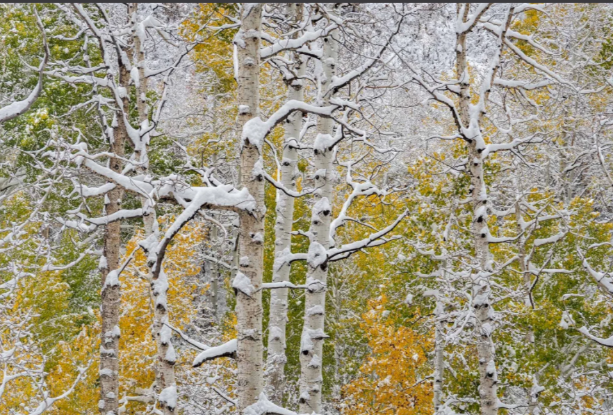 First Snow on Fall Leaves was created at Warner Lake (9400’) high in Utah’s La Sal Range, where the season’s first snowfall gently crowns autumn leaves during sunrise—a quiet marker of life’s changing chapters.