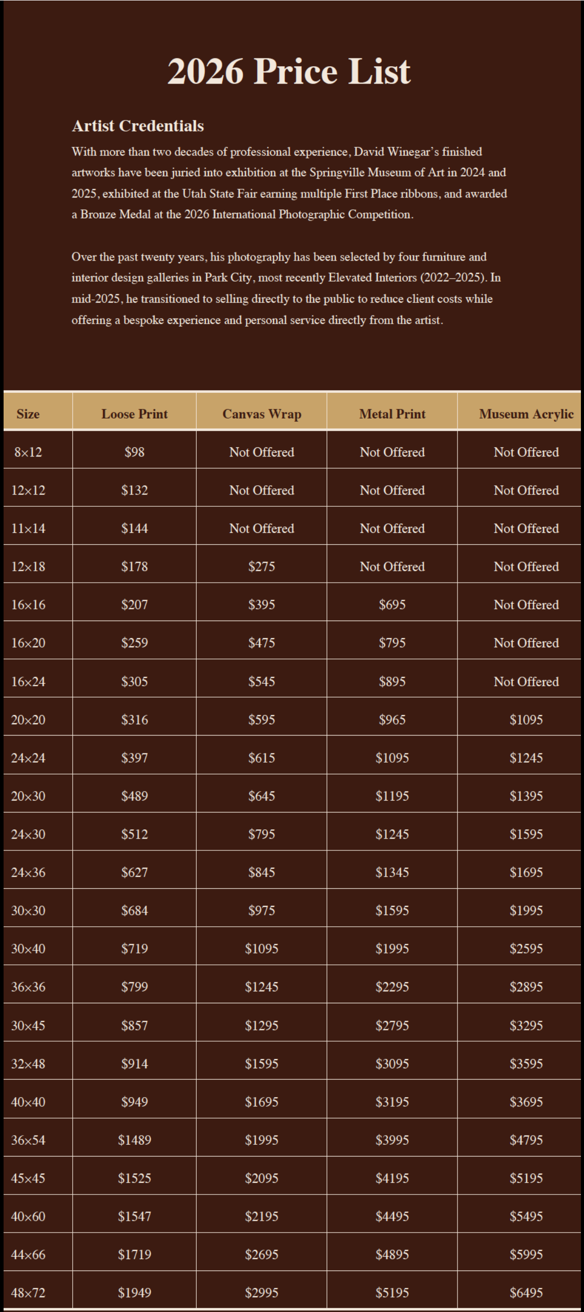 Every piece is personally overseen — and often printed — by me. Nothing is drop-shipped or mass-produced —-which almost all other photographers do. I supervise the craftsmanship and personally deliver your art!